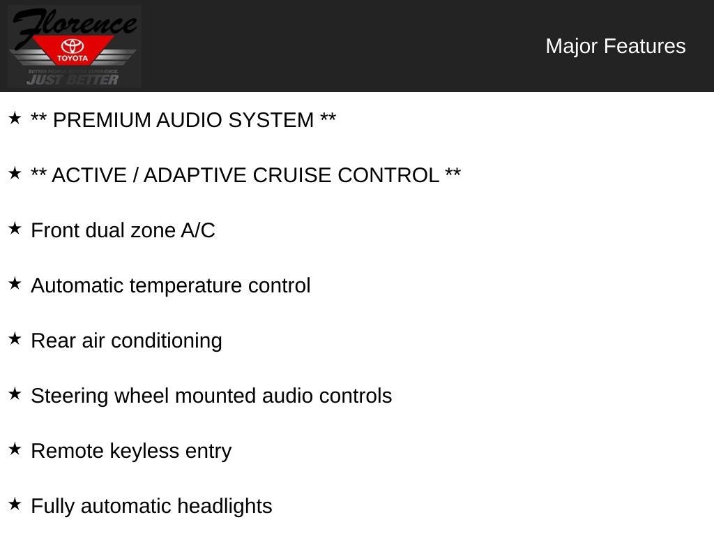 At Florence Toyota, come see how our USED CARS are JUST BETTER. We offer the following benefits: Lifetime Power Train (Some exclusions apply), 1st Year Maintenance, $500 Additional Trade In Appraisal, 72 Hour Vehicle Exchange Program, Yearly Vehicle Appraisal & Safety Inspection, VIP Loyalty Program, Routine Express Service, Courtesy Service Shuttle, Express Buying Service. Also, as an added benefit, we will buy your vehicle even if you don't buy ours!! Call today (866)830-0793 or visit us at www.florencetoyota.com *Customer must trade-in a vehicle to receive $1,000 Trade Assist credit that is included in the online price. **Financing must be provided by a third-party lender using this dealership’s assistance for Customer to receive $1,000 Financing Assist credit that is included in the online price. See dealer for complete details.