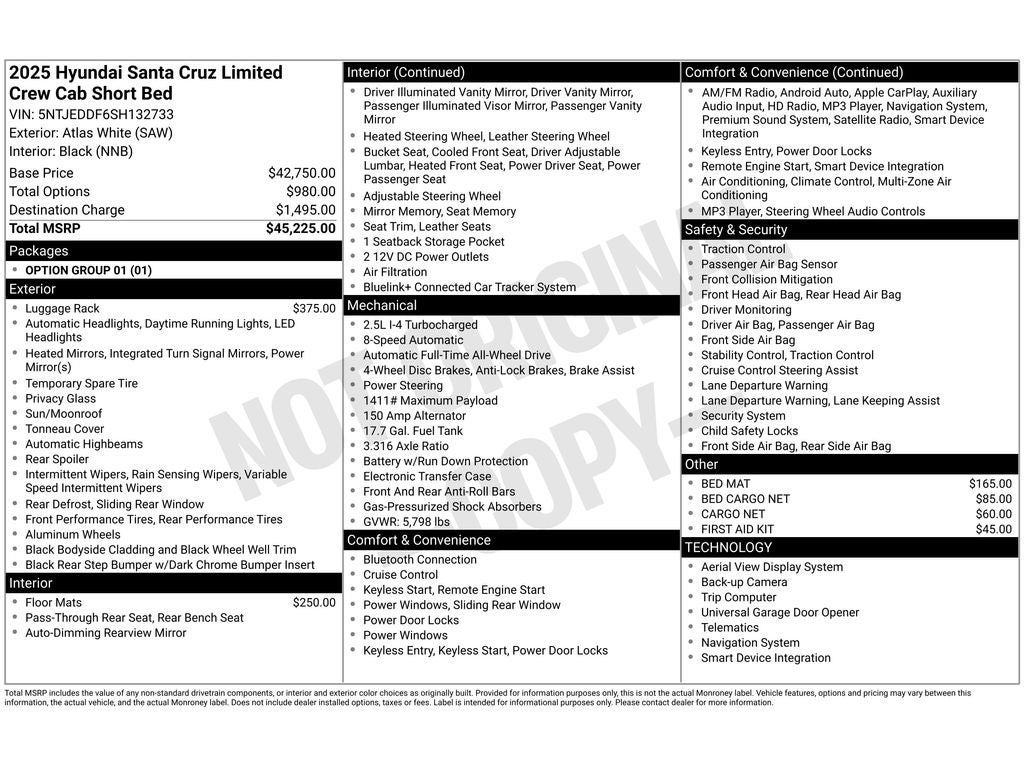 This vehicle features a hands-free Bluetooth® phone system. Good News! This certified CARFAX 1-owner vehicle has only had one owner before you. This unit is pure luxury with a heated steering wheel. The vehicle comes equipped with Android Auto for seamless smartphone integration on the road. This small pickup has a clean CARFAX vehicle history report. See what's behind you with the back up camera on it. The vehicle offers Apple CarPlay for seamless connectivity. This vehicle features a high end BOSE stereo system. Never get into a cold vehicle again with the remote start feature on this 2025 Hyundai Santa Cruz . The installed navigation system will keep you on the right path. The leather seats in this unit are a must for buyers looking for comfort, durability, and style. This unit offers Automatic Climate Control for personalized comfort. With the keyless entry system on this 2025 Hyundai Santa Cruz you can pop the trunk without dropping your bags from the store.