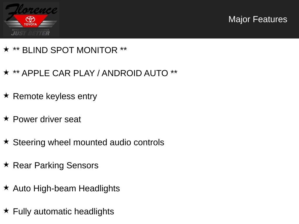 At Florence Toyota come see how our USED CARS are JUST BETTER. We offer the following benefits: Lifetime Power Train (Some exclusions apply), 1st Year Maintenance, $500 Additional Trade In Appraisal, 72 Hour Vehicle Exchange Program, Yearly Vehicle Appraisal & Safety Inspection, VIP Loyalty Program, Routine Express Service, Courtesy Service Shuttle, Express Buying Service. Also, as an added benefit we will buy your vehicle even if you don't buy ours!! Call today (866)830-0793 or visit us at www.florencetoyota.com *Customer must trade-in a vehicle to receive $1,000 Trade Assist credit that is included in the online price. **Financing must be provided by a third-party lender using this dealership's assistance for Customer to receive $1,000 Financing Assist credit that is included in the online price. See dealer for complete details.
