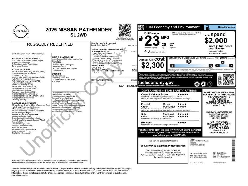 This model comes equipped with Android Auto for seamless smartphone integration on the road. This Nissan Pathfinder offers Apple CarPlay for seamless connectivity. The vehicle features a high end BOSE stereo system. See what's behind you with the back up camera on this Nissan Pathfinder. This vehicle is a certified CARFAX 1-owner. Our dealership has already run the CARFAX report and it is clean. A clean CARFAX is a great asset for resale value in the future. Maintaining a stable interior temperature in the vehicle is easy with the climate control system. Easily set your speed in this unit with a state of the art cruise control system. Increase or decrease velocity with the touch of a button. This mid-size suv features a hands-free Bluetooth® phone system. Keep your hands warm all winter with a heated steering wheel in this vehicle . The leather seats in this 2025 Nissan Pathfinder are a must for buyers looking for comfort, durability, and style. Help alleviate lower back pain with the driver seat lumbar support in this Nissan Pathfinder. You'll never again be lost in a crowded city or a country region with the navigation system on the vehicle. Load groceries and much more with ease into this unit thanks to the power liftgate. Never get into a cold vehicle again with the remote start feature on it. The Nissan Pathfinder is equipped with the latest generation of XM/Sirius Radio.