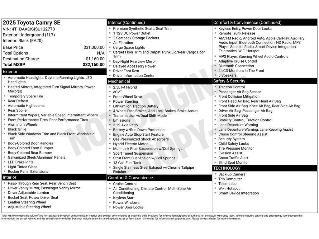 Discover exceptional value with this 2025 Toyota Camry Hybrid SE, located in Florence, SC. This low-mileage gem has only 18,967 miles and combines fuel-efficient performance with modern comfort. Powered by a 4-cylinder 2.5L Full Hybrid Electric (FHEV) powertrain and front-wheel drive, it delivers a smooth, economical ride ideal for daily commutes and longer trips. This Toyota Camry Hybrid SE offers a refined interior with leather seats and automatic climate control for consistent comfort. Stay connected and hands-free with Bluetooth® phone and audio integration, and back up confidently using the integrated back-up camera. The vehicle's CARFAX 1-Owner history provides added assurance of careful ownership and maintenance. Priced to move, this Toyota Camry Hybrid presents the best price in the area for comparable models, making it a smart choice for buyers seeking value without compromising features. The combination of low mileage, efficient hybrid technology, and sought-after amenities makes this sedan a practical and stylish option for drivers prioritizing economy and reliability. Located in Florence, SC, this Camry is ready for a test drive. Schedule a viewing to experience the responsive hybrid performance, comfortable leather-appointed cabin, and thoughtful tech features. With its strong pedigree and competitive pricing, this 2025 Toyota Camry Hybrid SE won't last long.