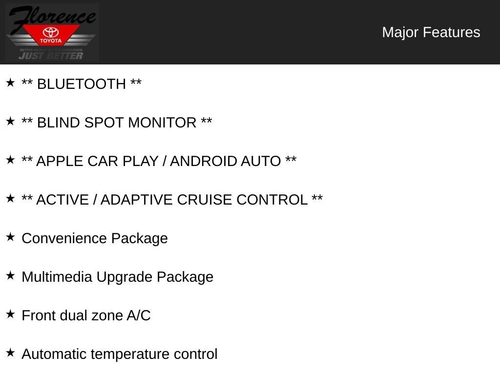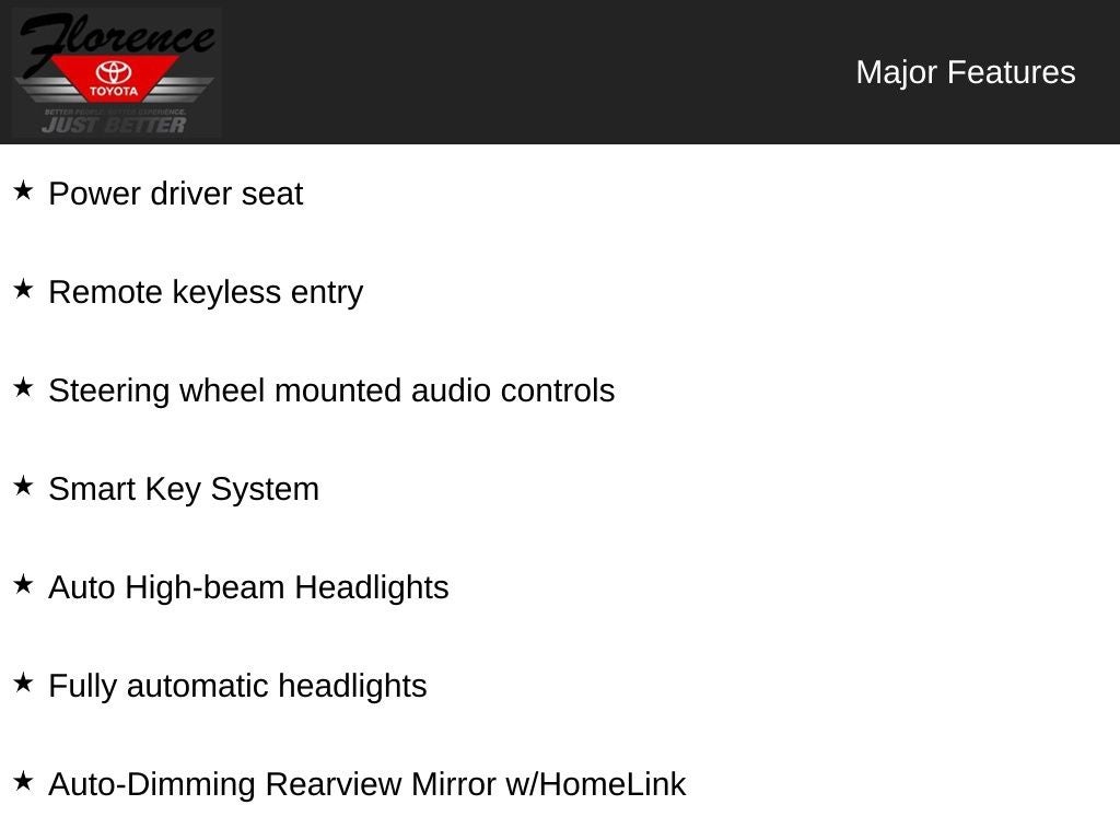 At Florence Toyota come see how our USED CARS are JUST BETTER . We offer the following benefits: Lifetime Power Train (Some exclusions apply), 1st Year Maintenance, $500 Additional Trade In Appraisal, 72 Hour Vehicle Exchange Program, Yearly Vehicle Appraisal & Safety Inspection, VIP Loyalty Program, Routine Express Service, Courtesy Service Shuttle, Express Buying Service. Also, as an added benefit we will buy your vehicle even if you don't buy ours!! Call today (866)830-0793 or visit us at www.florencetoyota.com *Customer must trade-in a vehicle to receive $1,000 Trade Assist credit that is included in the online price. **Financing must be provided by a third-party lender using this dealership’s assistance for Customer to receive $1,000 Financing Assist credit that is included in the online price. See dealer for complete details.