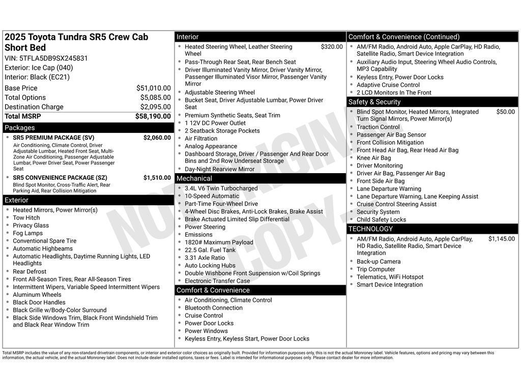 SR5 Convenience Package - Includes Blind Spot Monitor (BSM) Front and Rear Parking Assist with Automatic Braking and large fuel tank (32.2 gallons): 122L Fuel Tank; Blind Spot Monitor with Lane Change Assist; Parking Support Alert/brake SR5 Premium Package - Includes SofTex-Trimmed 8-Way Power-Adjustable Driver/FR-Pass Seat w/Power Lumbar heated front seats dual zone automatic climate control and color-keyed outer door handles: Automatic Power Tailgate with Easy Closing; SofTex Seat Trim; 8-Way Power-Adjustable Heated Front Seats Premium Audio Heated Power Black Outside Mirrors **Equipment listed is based on original vehicle build and subject to change. Please confirm the accuracy of the included equipment by calling the dealer prior to purchase.**