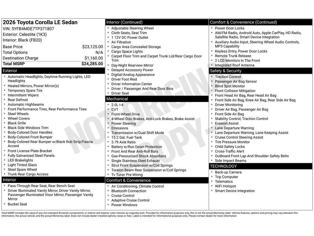 Small and nimble this model scoots through traffic. It offers great fuel mileage and ease of parking. Good News! This certified CARFAX 1-owner vehicle has only had one owner before you. Bluetooth® technology is built into this 2026 Toyota Corolla , keeping your hands on the steering wheel and your focus on the road. The vehicle offers Android Auto for seamless smartphone integration. Apple CarPlay: Seamless smartphone integration for this model - stay connected and entertained on the go! Protect it from unwanted accidents with a cutting edge backup camera system. It keeps you comfortable with Auto Climate. The Toyota Corolla enhances safety with a blind spot monitor, alerting drivers to potential dangers in adjacent lanes. This Toyota Corolla warns of approaching vehicles with Cross-Traffic Alert.